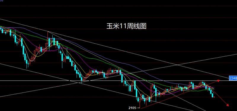 The corn 11 market opened at the 2232 position last week and the market rose slightly. The market fluctuated and fell. The weekly line was at the lowest point of 2193 and then the market consolidated. After the weekly line finally closed at the 2203 position, the weekly line closed with a large negative line with a long lower shadow line with a long lower shadow line. After this pattern ended, the short stop loss of 2235 this week, the target below was 2193, and the market fell below.