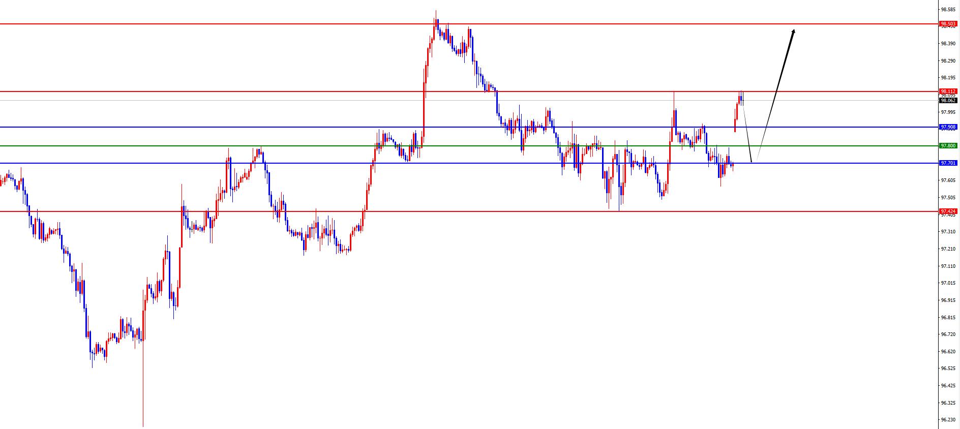 The US dollar index has a long range of 97.70-80, with a defense of 5 US dollars, and a target of 98.20-98.50
