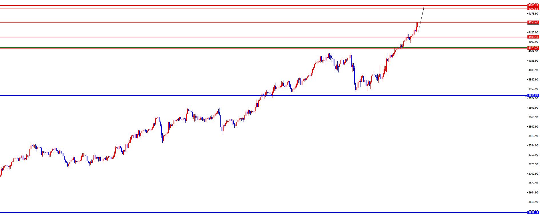 A partir d'une analyse multi-cycles, observez d'abord le rythme mensuel. Dans une perspective à long terme, la position 3130 constitue le tournant de la tendance à long terme. Le prix peut être traité tant qu'il se situe au dessus de cette position. Du point de vue du niveau hebdomadaire, la ligne de démarcation actuelle entre les lignes hebdomadaires longues et courtes se situe à 3 585, et le prix peut être traité tant que la ligne médiane est au-dessus de cette position. Au niveau quotidien, nous devons pour le moment prêter attention au support de la zone 3932, et les bandes au-dessus de cette position devraient être davantage traitées. D'un point de vue de quatre heures, le point bas atteint hier en début de séance est le support clé de quatre heures. Après la chute du prix, il a maintenu une forte hausse. Le support actuel de quatre heures se situe dans la zone 4073-4075. Le prix peut rester à cette position et le traiter davantage. A l'heure, l'heure continue de mettre en valeur le concept extrêmement fort. Dans le même temps, les récentes fortes hausses se situent toutes sur le marché asiatique, il faut donc saisir l'opportunité sur le marché asiatique. Sinon, il sera difficile de se défendre lors des opérations intrajournalières, ou d'entrer sur le marché après un petit ajustement en 15 minutes.