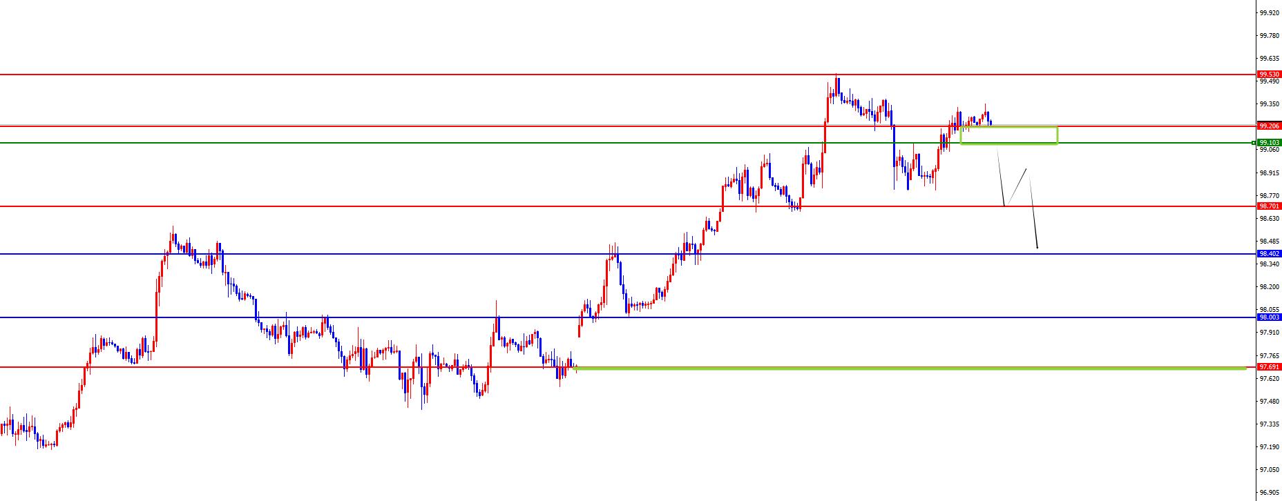 D'après une analyse multi-cycles, le prix hebdomadaire s'est stabilisé la semaine dernière après avoir continué à fluctuer au début. Le support hebdomadaire actuel se situe dans la zone 98, et une attention de suivi sera accordée à d'autres hausses à moyen terme. À partir du niveau quotidien, au fil du temps, le support quotidien actuel se situe dans la zone de 98,40 et la fourchette de prix au-dessus de cette position augmentera encore. Dans une perspective de quatre heures, lorsque le prix est tombé en dessous du support de quatre heures vendredi dernier, il était sous pression à court terme. Dans le même temps, nous devons prêter attention à l'écart de position de la semaine dernière. La résistance actuelle de quatre heures se situe dans la plage 99,10-20. Le prix se consolidera à la hausse et à la baisse à cette position à court terme. Nous continuerons à prêter attention à cette position en cas de baisse ultérieure afin de lancer des mesures d'ajustement à court terme. Les prix sont également sous pression à l'heure. Par conséquent, sur la base d'une vision globale, les radicaux sont actuellement sous pression en raison du point haut de la semaine dernière, proche du début des échanges d'aujourd'hui. Les conservateurs peuvent attendre qu’il tombe en dessous de 99,10 avant de suivre.