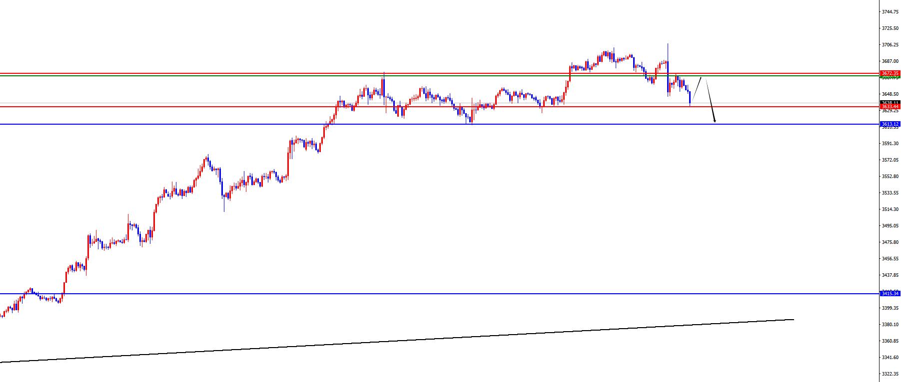 oro 3670-3672 è vuoto nella gamma, con una difesa di US $ e un obiettivo di 3633-3613