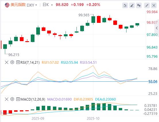 월요일 미국 달러 지수는 변동성 패턴을 유지하다가 결국 0.06% 소폭 상승 마감했습니다. 현재 미국 달러 가치는 98.82입니다.