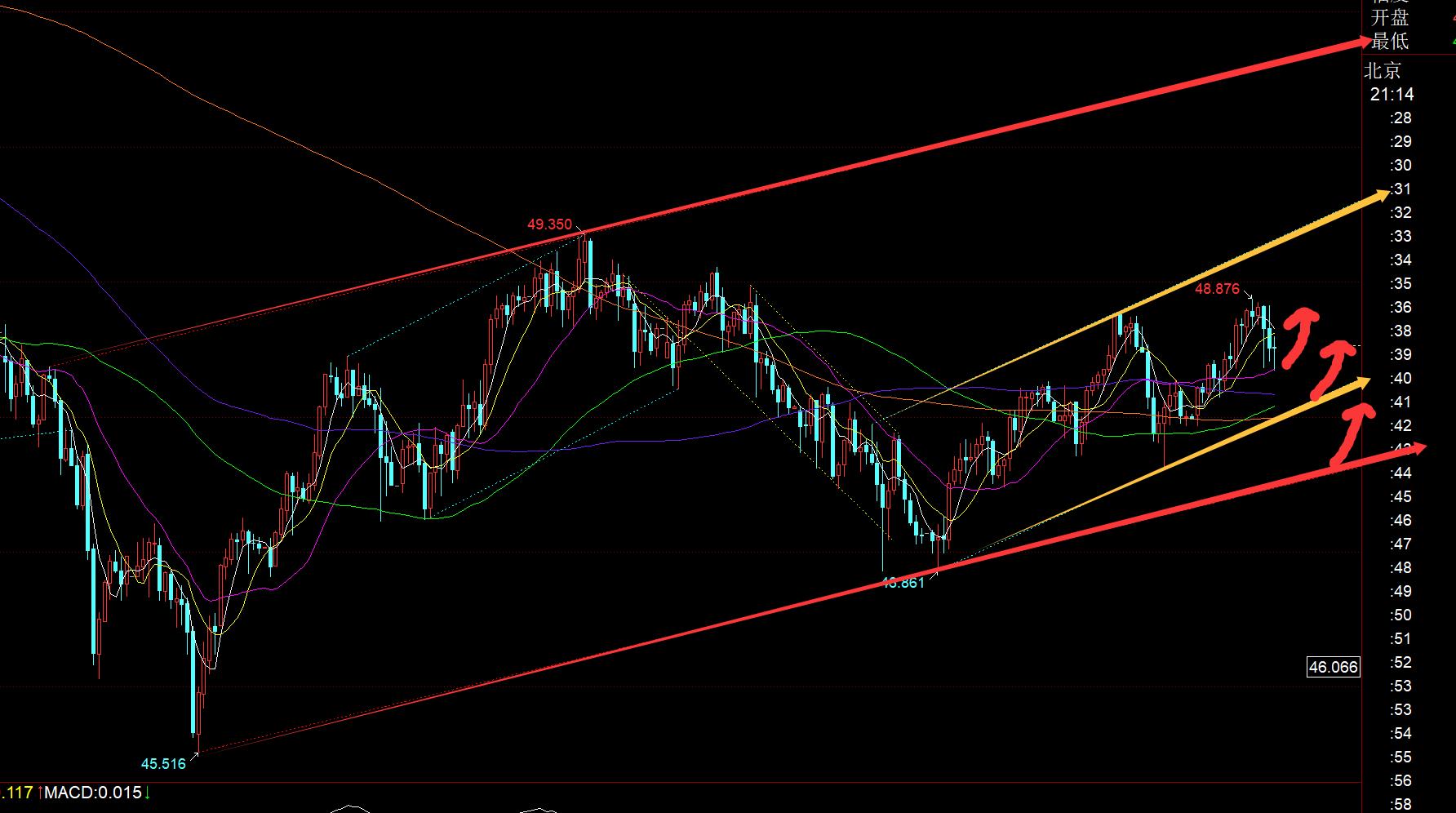 실버: 위 그림에서 빨간색 채널의 위쪽 채널에도 있고 작은 채널은 노란색 위쪽 채널에 있습니다. 현재 시간당 중간 레일 지원은 48.35이고, 일중 618 분할 지원은 48.3입니다. 첫째, 지원 안정화에 주의를 기울이십시오. 노란색 채널의 하단 레일 지지대는 48입니다. 이 위치에는 안정된 리바운드도 있습니다. 더 약한 경우 빨간색 채널 47.6의 하단 레일 지지대가 됩니다. 따라서 충격에 대비해 오늘 밤 이 세 곳의 지지 및 안정 신호에 주의하세요. 바닥을 테스트하고 K나 다양K를 끌어올리면 다음 1시간 뒤에 들어서서 뒤로 물러나면 테스트해볼 수 있다. 저항은 48.85와 49.4입니다;