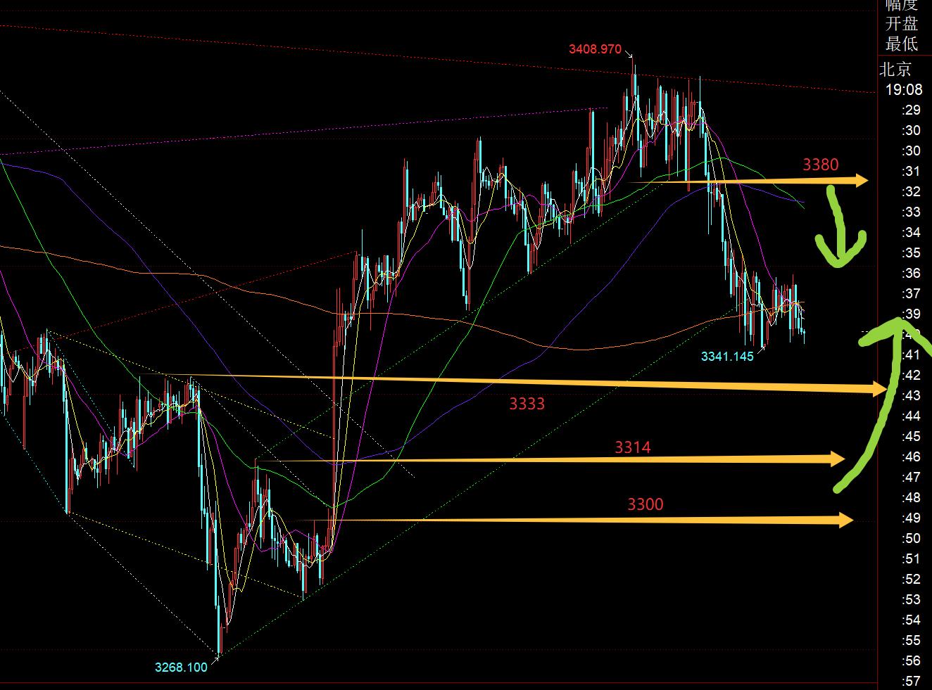 第一,黄金方面:上周五一直围绕3400-3380这20米区间内跑了一天,而昨日开盘仍承压3400无法站上,由于日线收线还是处于5日之上,且是长下影十字K,和前一天阳线形成右肩十字长组合形态,在一路拉升过程中,它更多的是作为续涨来对待,因此一早回调至小时线前期上行通道上轨支撑点3386之上继续测试看涨,但行情选择了向下破位,失守上周五隔夜低点也就失败出局;这也意味着短期走势发生了改变,由上周一路偏强上攻转为偏弱下调,午后计划反弹确认通道上轨承压点3390跟随看回落,但不给机会,只是横盘压制顶底阻力3380直接走了一波欧盘持续慢跌,美盘抵达3350一线;欧盘弱势,美盘存在二次打压,但这种慢跌,无力反抽,给不到预期反弹阻力位,等小时线出现底部长下影反阳K时,回踩确认3350跟随一波反弹,抵达3361收米拿下,等3370-80阻力区反手依然给不到机会;