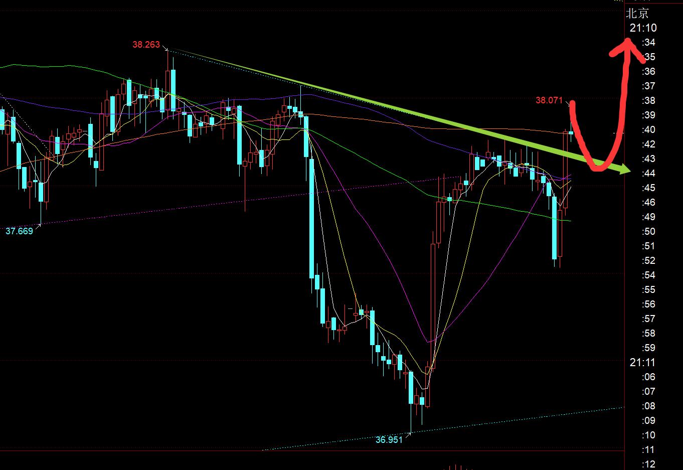 白银方面:昨日也是探底收不错的反阳,重新回到日线原先的上行通道之内,那么今日回踩确认下轨支撑点就是37.55一线,这也是今日早间给出的看涨位,同时靠近昨日涨幅50分割位置;欧盘震荡下滑,刚好触及37.55,顺利一波拉升走高,突破亚盘高点,那么今晚还有二次延续,关注37.9一线,回踩确认趋势线稳定,则继续看涨,上方阻力目标先关注38.4;