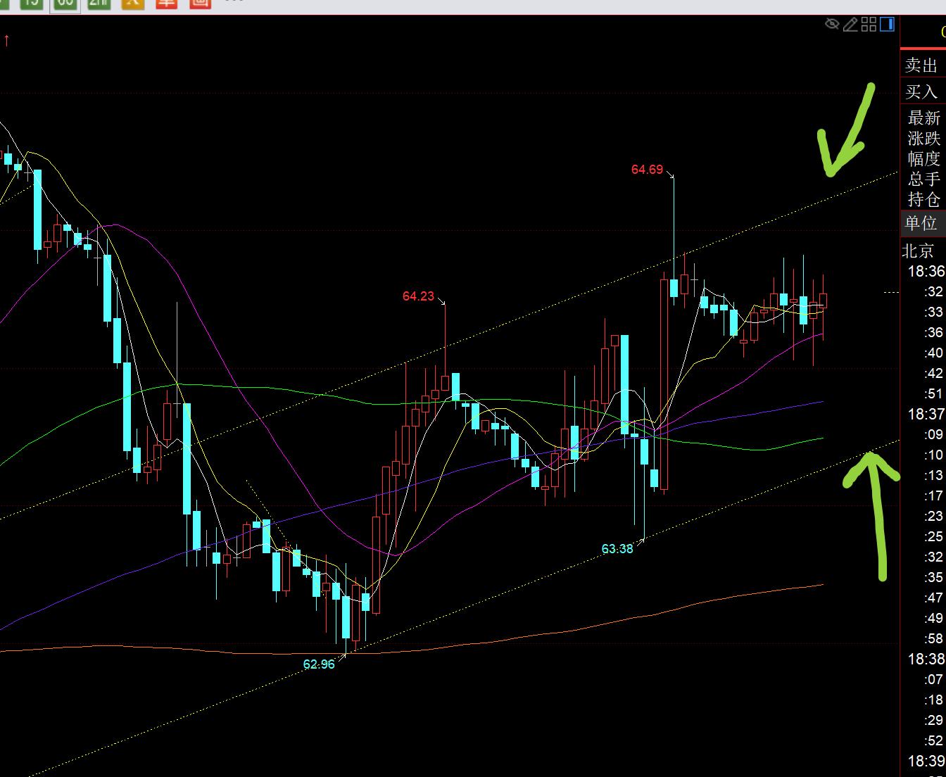 原油方面:日线级别就继续关注日线和10均线哪边有效突破的问题,届时进行跟随;而图中小时线级别,有一个上行通道可以关注下,上轨64.6,下轨63.7,区间幅度不大,靠边再看信号;