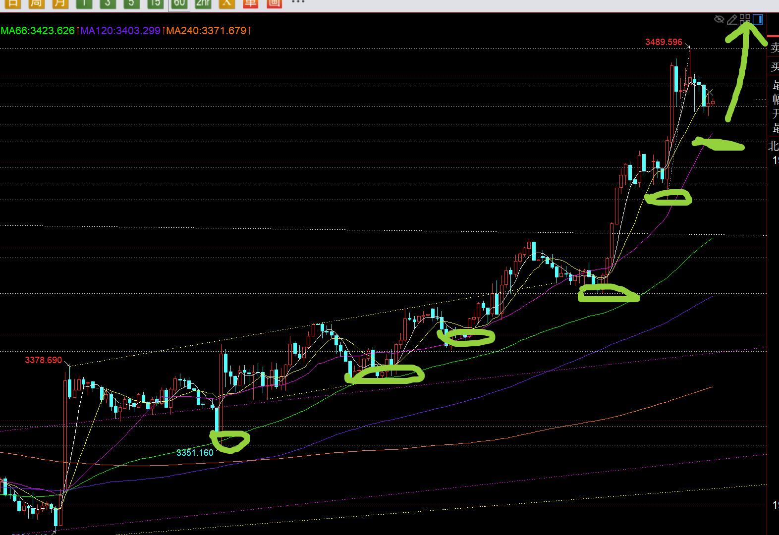 第三,黄金4小时级别:一旦进行单边趋势拉升,此周期的10均线基本很难再失守,会一路保持5均线之上拉升,最多刺破5均线,稳定于10日之上再继续拉升;早间的低点3436正好触及5均线发力,这点其实有些被忽略了;
