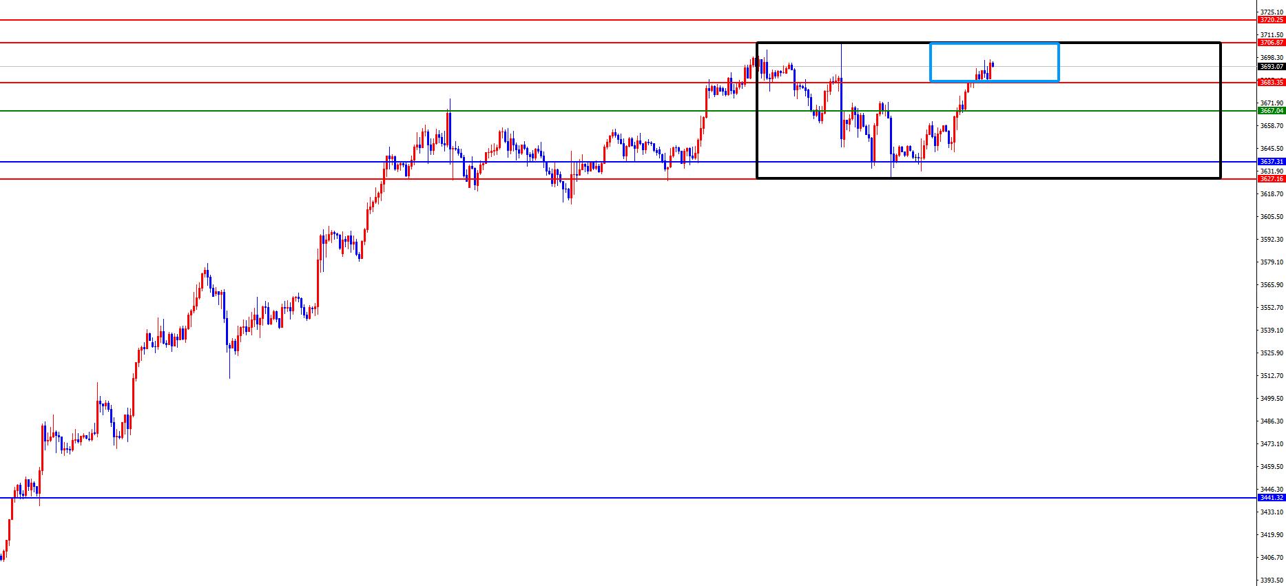 A pequena faixa de ouro é 3707-3683 e a grande faixa é 3627-3707. Somente depois de romper, você continuará