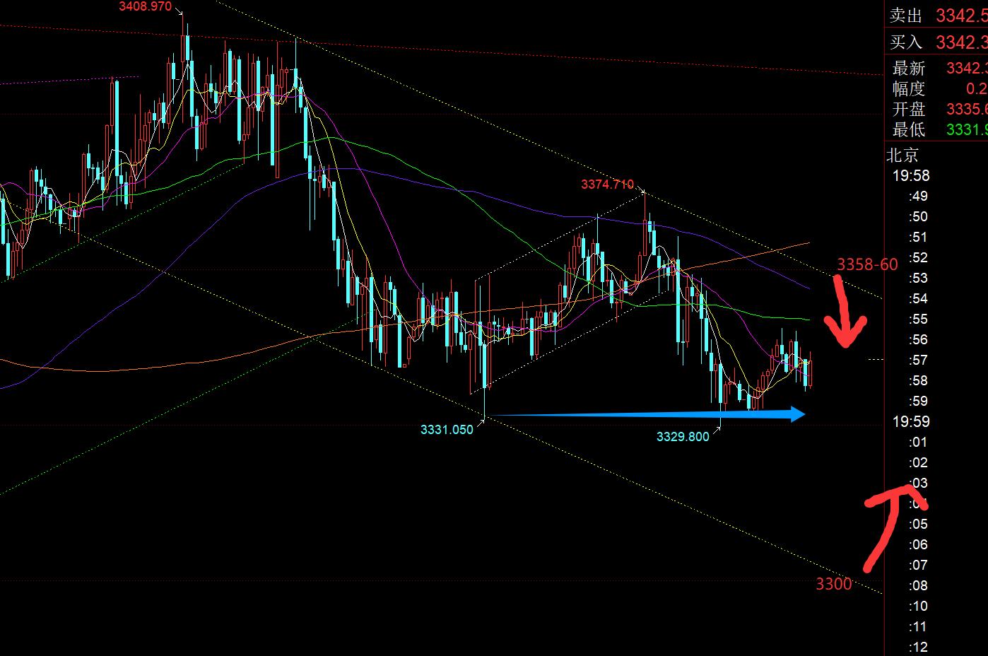 第三,黃金小時線級別:原本隔夜持續打壓走弱,期待今日早間能先續跌一小波,最好刺破隔夜低點,那樣是可以果斷先低位看漲反彈一波;因為早間延續性都較差,且macd會因為底背離而反抽向上,可惜它並未發生,3322埋伏等待看漲也就給不到機會;而10點收報一根長下影反陽K,一般是容易向上延續反彈,但看到上方第一阻力3343較近,空間不大,也擔心類似昨日走法,當出現一根企穩K時,去跟隨看漲,入場位置肯定會高於企穩K的低點,而它只是反彈幾美金,又陷入橫盤壓制,或出陰,那個時候就會有些揪心,只有把握住早間低位,比如3333、3332,那麼去持有會問題不大,但那個時候早間還在偏弱下行測試,並未出企穩K;所以,這兩天的行情就是要膽大些,不出企穩K前,第一時間在下跌過程中低位直接出手,這樣也是存在一定風險,萬一下跌沒剎住車呢,慣性多下滑了些,刺破再上拉;因此,這也是震盪中相對不好出手的原因;只能耐心等它區間擴大,相對強壓區,或強支撐再去嘗試,可能等很久,可能一天都給不到,但起碼安心些,盡量等適合你的行情走勢,震盪過程中,中間位置還是盡量別參與;