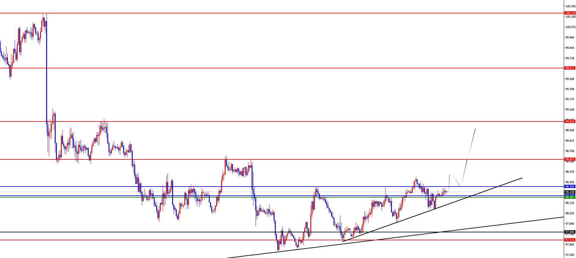 從多周期分析,週線級別來看近期價格在周線支撐上下盤整,本週重點關注98.30位置站穩,一旦站穩則中期多頭將延續上行。在日線級別上,在上週價格壓制在日線阻力位置下方持續震盪,目前日線阻力於98.20位置,目前在此區域震盪,後續關注進一步突破上漲。從四小時上看,四小時上是我們一直強調短期價格走勢的關鍵,目前價格依舊在四小時支撐98.20上方,所以暫時短期依舊偏多。從一小時上看,觀察下方圖表趨勢線可以看到,目前短線先關注98.10-20區間支撐,上方關注98.60-99區域。