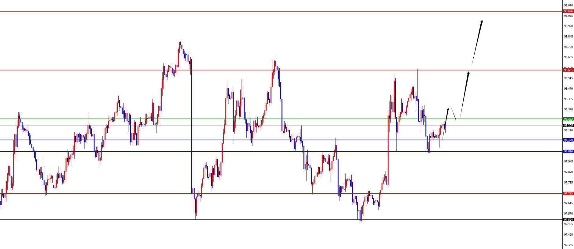 從多周期分析,週線級別來看近期價格在周線關鍵上下盤整,目前週線阻力於98區域,價格在周二再度向上突破,昨日價格繼續回踩,目前在此位置之上繼續按照震盪偏中線多對待。從日線級別看,暫時需要關注98.10區域支撐,所以目前價格只要沒有收盤在日線及週線支撐下方繼續偏波段多對待。四小時上暫時關注98.25區域的站穩,站穩後將繼續延續。一小時上目前同樣偏多,上方重點關注98.60-99區域。