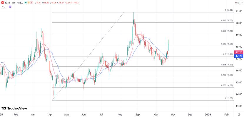 Zum Beispiel hat der Einstieg von Li Ning in die Instant-Retail-Plattform höhere Anforderungen an die Kommissionierung im Geschäft, die Verpackungseffizienz und die Personalausstattung gestellt. Wenn der Prozess nicht ordnungsgemäß verwaltet wird, können die Betriebskosten einer einzelnen Filiale steigen. Instant-Einzelhandelsplattformen erheben in der Regel eine bestimmte Provision, und Werbeaktionen können häufiger stattfinden. Sie müssen auf ihre endgültige Auswirkung auf die Nettogewinnmarge des Produkts achten. Der Aktienkurs von Li Ning stieg über Nacht in den USA deutlich an, doch die Hongkonger Aktien konnten heute nicht diesem Beispiel folgen, erreichten einen neuen Höchststand seit dem 10. September und gaben dann nach. Wenn der Kurs im Laufe des Tages unter 18 HK$ schließt, wird er unter Druck geraten, auf 17,20 HK$ zu fallen. Zu diesem Zeitpunkt wird das Augenmerk auf die wichtige Unterstützung gelegt, die durch die wichtigsten gleitenden Durchschnitte auf dem Tages-Chart gebildet wird.