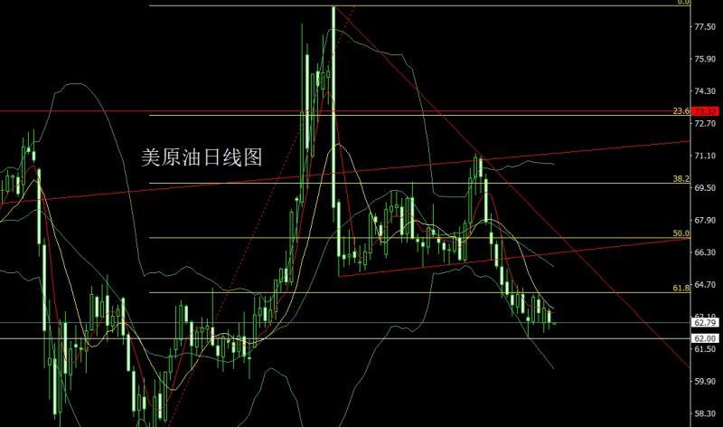 The US crude oil market opened lower yesterday at 63.39 and then the market closed at 63.52, and then the market fell strongly. The daily line was at the lowest point of 62.48, and the market consolidated. The daily line finally closed at 62.84, and then the market closed with a very long lower shadow line. After this pattern ended, today's short stop loss of 63.7, the target below 62.5, and the target below 62 and 61.6 and 61.3.