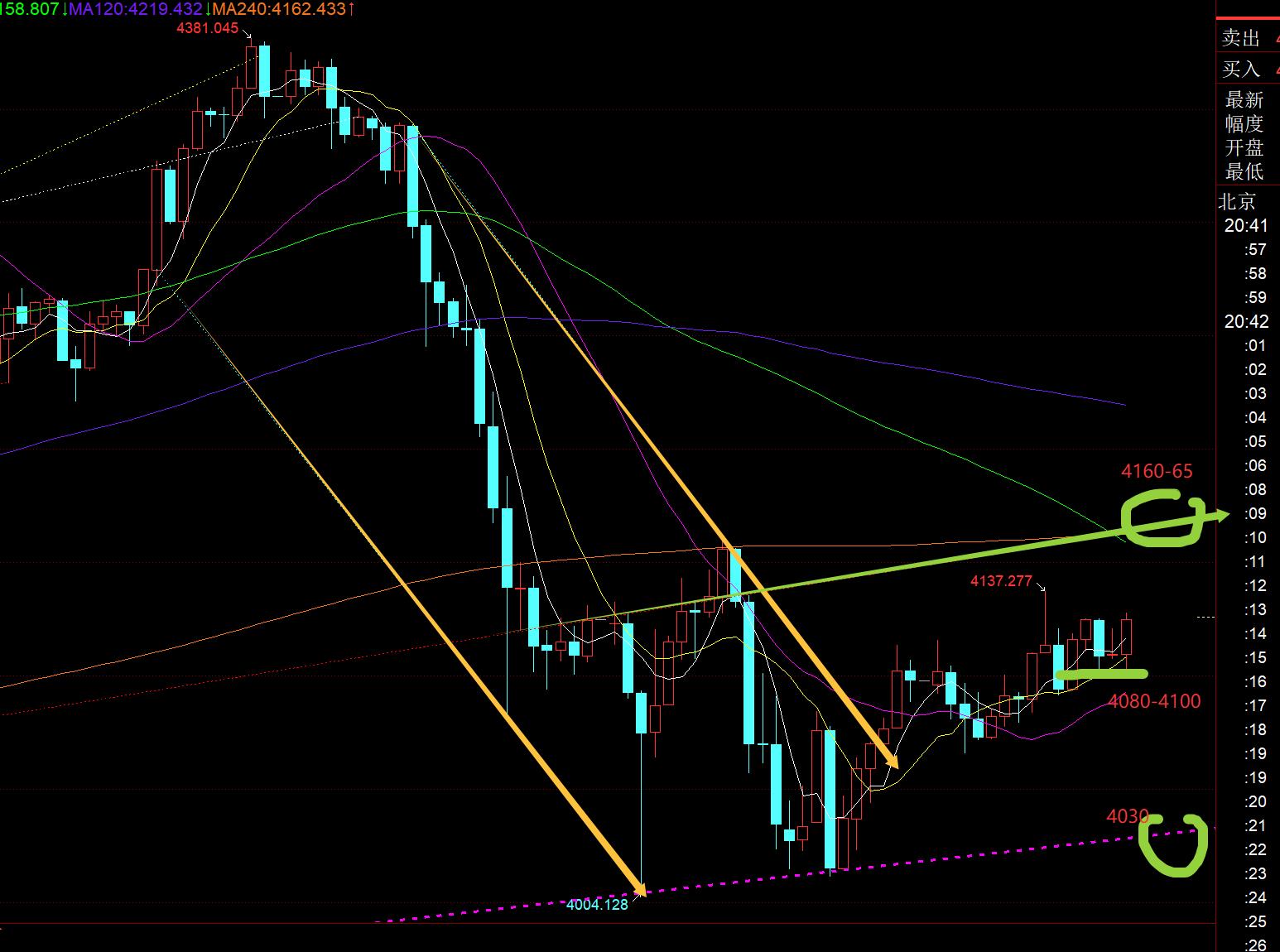 Primero, oro: la rápida y continua caída de ayer por la mañana liberó fuerza corta durante la noche, y temprano en la mañana sabíamos que la continuidad era pobre y que era fácil tocar fondo y tirar subió y subió a un máximo de 4161. La resistencia original era centrarse en la línea 41 50, si se suprime, estará en la parte inferior. A las 15 en punto, simplemente cerró un Yang y atravesó 4150. La última vez, pisé el trueno. Esta vez soy más cauteloso. Necesito esperar a que aparezcan al menos dos Yang K consecutivos antes de poder decidir si es efectivo. xmxyly.como se esperaba, el mercado europeo cayó rápidamente y alcanzó la línea 4015 antes que el mercado estadounidense. Esta posición es el punto de soporte derivado correspondiente a la línea de tendencia clave desde el soporte 3311. También tendí una emboscada de antemano y agarré algunos metros; Por segunda vez en el mercado estadounidense quería planificar esta posición para continuar el rebote alcista. , desafortunadamente solo se dio a 4023;