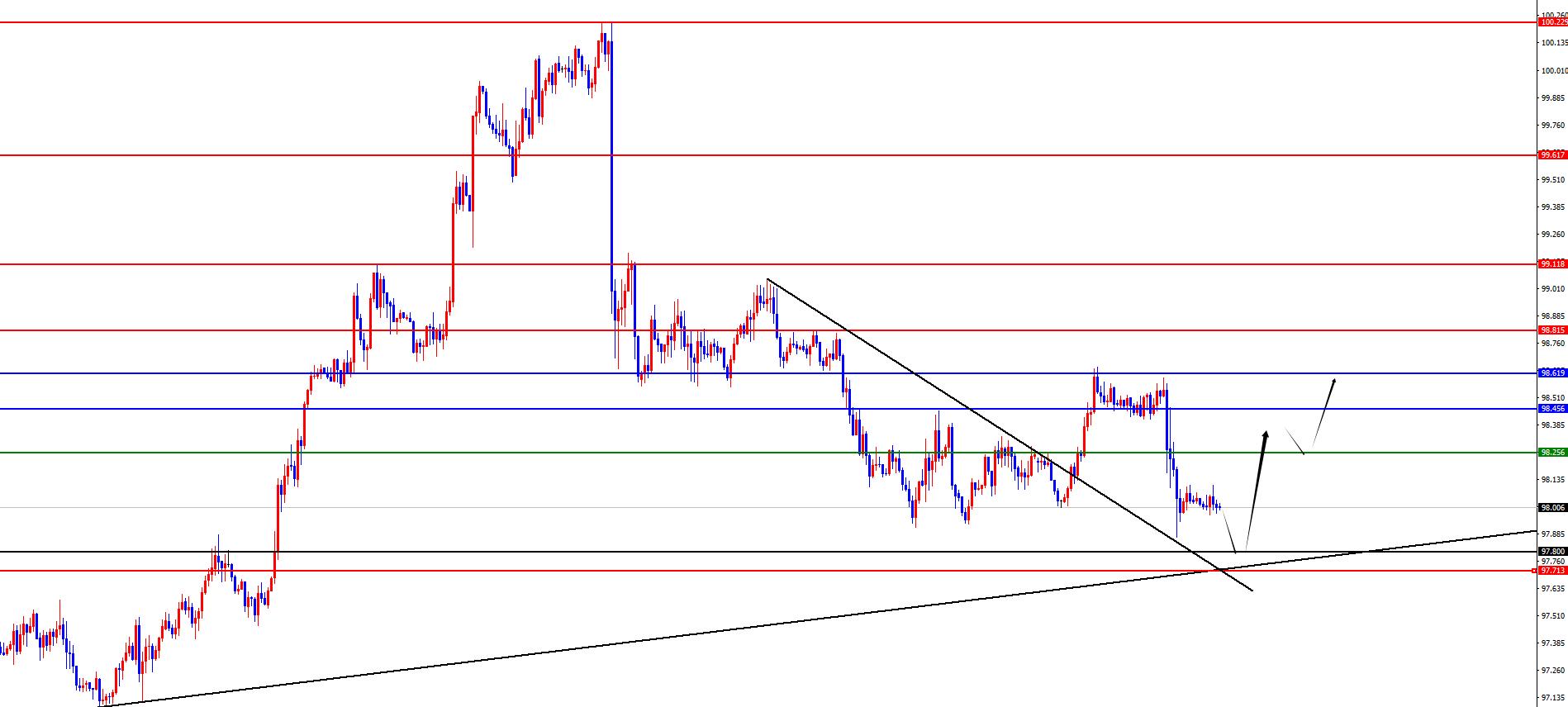 从多周期分析,周线级别来看价格在上上周突破周线阻力,随后在上周再度下破周线支撑,近期价格在周线支撑上下盘整,本周重点关注98.50位置能否站稳是关键。在日线级别上,在上周三跌破日线支撑后,目前价格压制在日线阻力98.60位置,昨日再度承压下跌,目前波段市场偏空,但是整体我们需要关注趋势线支撑得失。从四小时上看,四小时上是我们一直强调短期价格走势的关键,昨日价格再度跌破四小时支撑位置,但是整体四小时价格更偏向于震荡,四小时阻力目前于98.25位置,所有目前暂时切勿追空,后续关注近期低点及趋势线支撑区域。一小时上价格目前关注趋势线支撑97.70-80区间支撑,上方关注98.25得失,后续突破再看日线及周线阻力。
