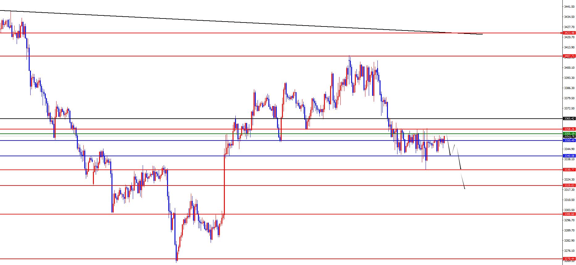 从多周期分析,首先观察月线节奏,价格在5月份正如笔者所言按照节奏运行,并且最终十字状态,6月份最终价格依旧是反K状态收尾,针对目前需要关注月线高低点得失。从周线级别看,周线上近期价格持续高位震荡,随着时间的推移周线分水岭暂时于3337位置,本周重点关注此位置得失。按照日线级别看,价格上周依托日线支撑直接上涨,但是本周价格再度测试并且刺破日线支撑,目前在此区域震荡,总体日线有进一步承压的表现。从四小时级别看,价格目前压制在3355-3356区间,同时上方3360-65也是关键阻力,所以暂时还是偏空。一小时上价格在经过昨日震荡修正后,目前关注昨日高点得失。所以整体价格不破3365暂时按照偏空对待,下方关注3330-3320-3300区域。