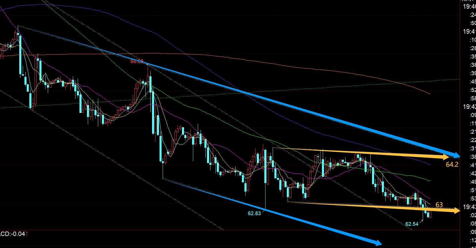 原油方面:从图中分布看,日内走势还是显得偏弱,黄色通道下轨支撑63有所下破,不过macd始终存在底背离状态,也不宜低位再看跌,容易出现超跌反弹;今晚留意63,若重新突破站上,则上方关注双通道反压点64.2一线;当然,日线级别中轨或66日均线阻力依然较大,拉高再去选择看跌震荡;