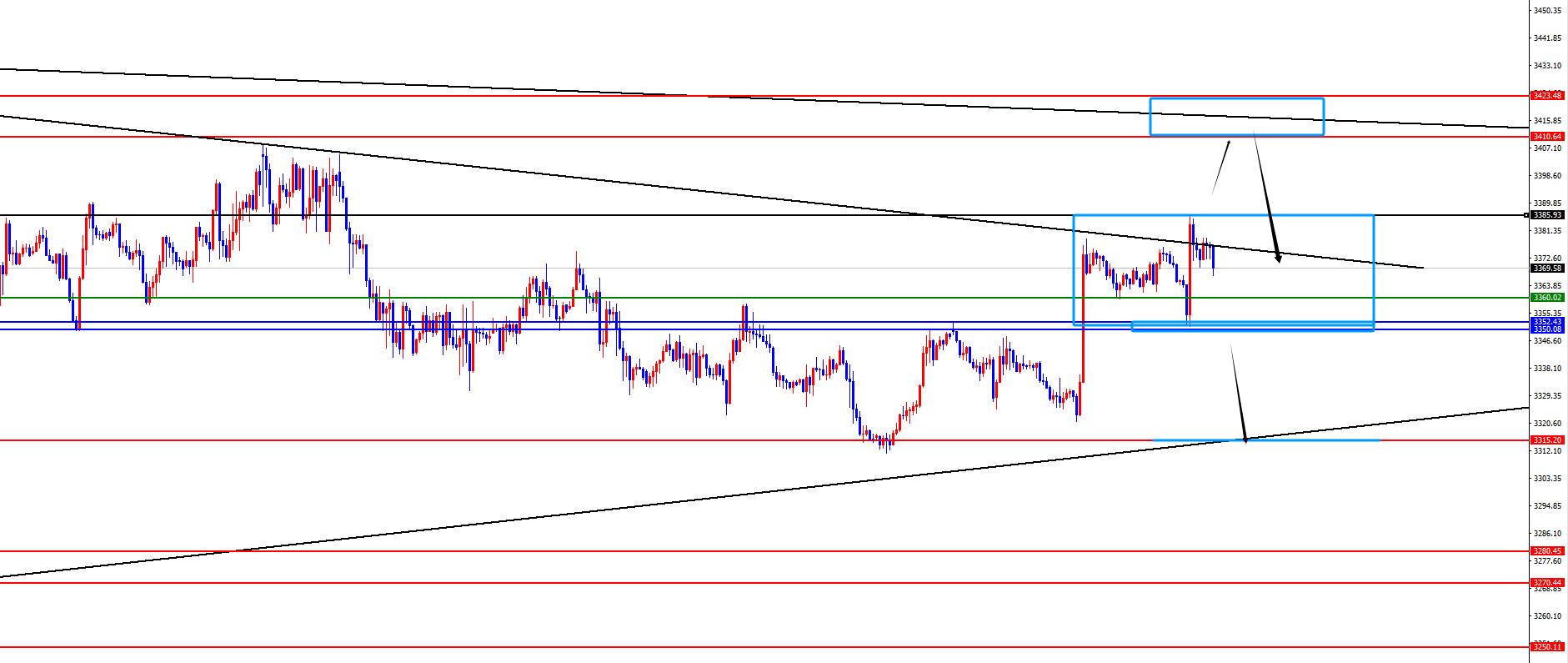 黄金3350-3351为分水岭,不破早盘高点先看承压,意外冲高则关注3410区域压制