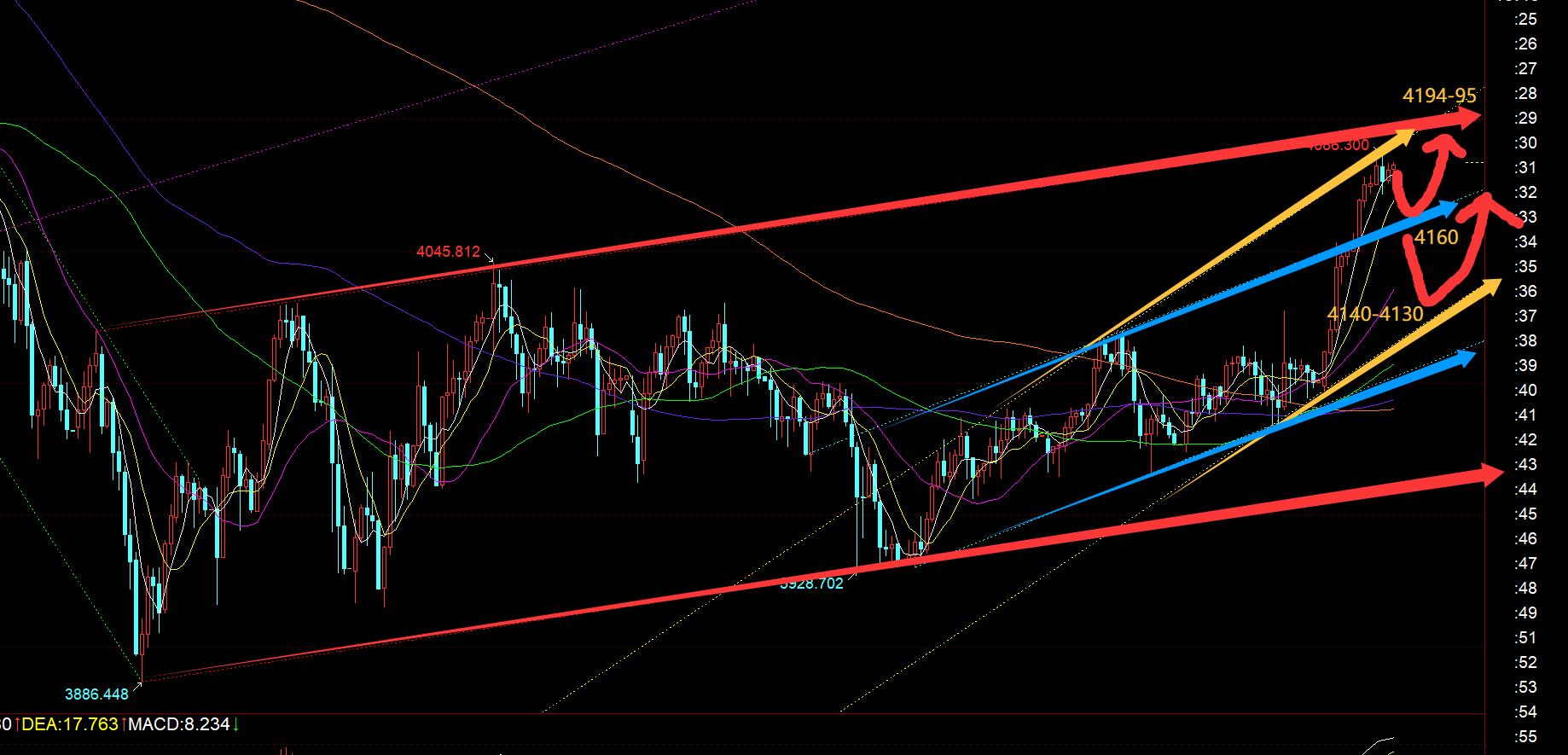 第四,黄金小时线级别:周视频本计划今日早间3990上继续试探看涨,结果开盘4000左右直接一路飙升,丝毫不回头,突破上图蓝色上行通道上轨阻力4053之后,继续破高冲击4086目前高度;而亚欧盘的持续拉升,意味着美盘还有二次走高,但不回踩一波,的确也不太敢直接跟随,毕竟日内涨幅已经接近90米,也担心上周四那样,白天强的不回调,晚上一回调就弱趴下;不过,这次应该不太会洗盘太多,毕竟冲破了4040关键前面阻力位;今晚首要支撑留意蓝色通道上轨回踩确认点4060上,其次是4040一线也会接近中轨位置,极限极限是黄色新通道下轨4030-20,只要敢拉低,都要敢于继续看涨为主;而短期阻力先留意近期红色大通道上轨4094-95一线,若这里突破站上的话,就是逐步看4133-4155范围;