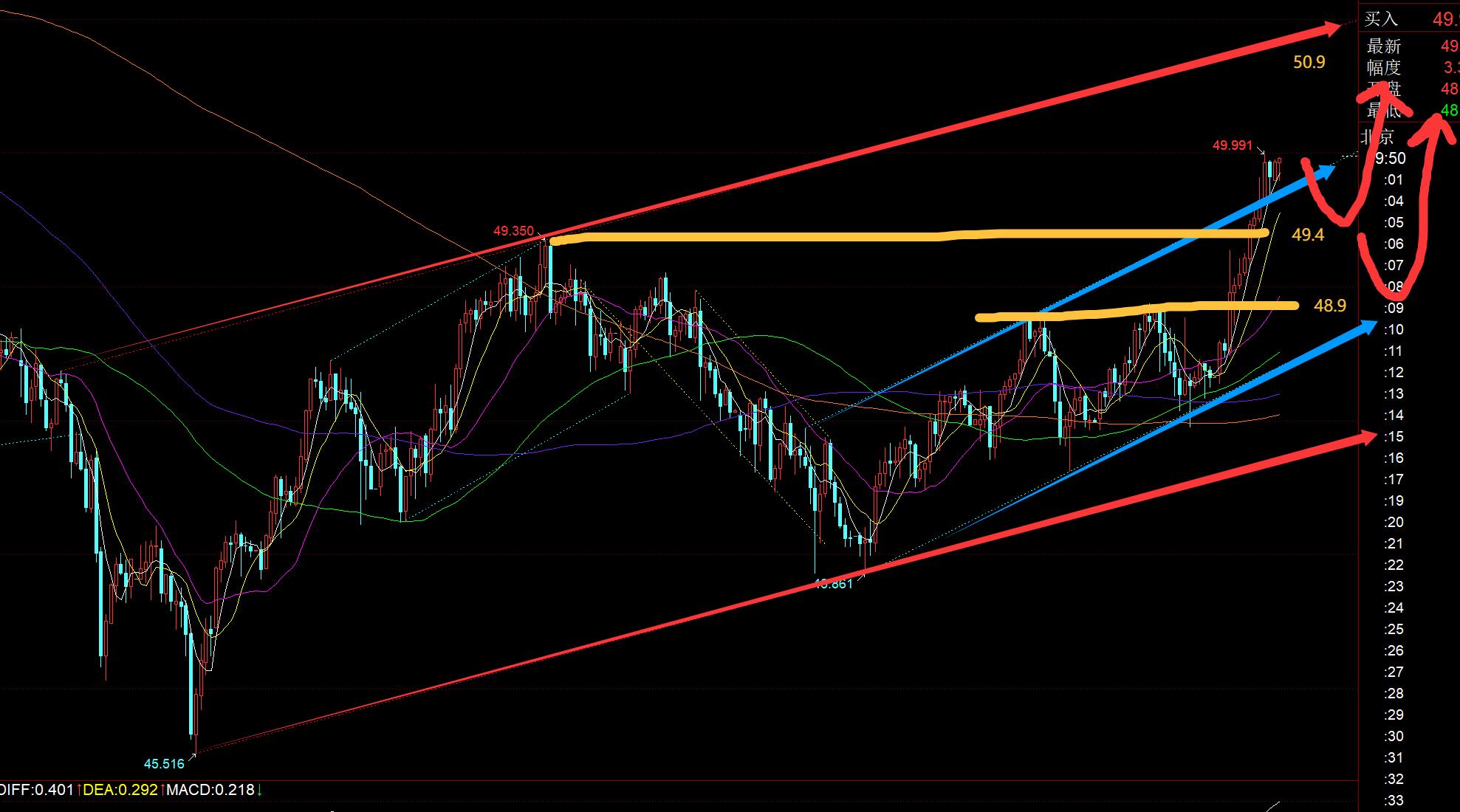 白银方面:今日也是大幅拉升,目前是有所突破站上49.4关键阻力位,还需看今日收线来明确;只要日K收盘站上,那么至少会产生次高点冲击51一线,其次是52.5;当前从上图通道看,49.65上支撑,若失守此处,则重点留意49.4顶底位置,和48.8-48.9,接近日内618,以及前两日的顶底;拉低企稳继续看涨为主,再往上冲击的目标阻力是50.9-51;
