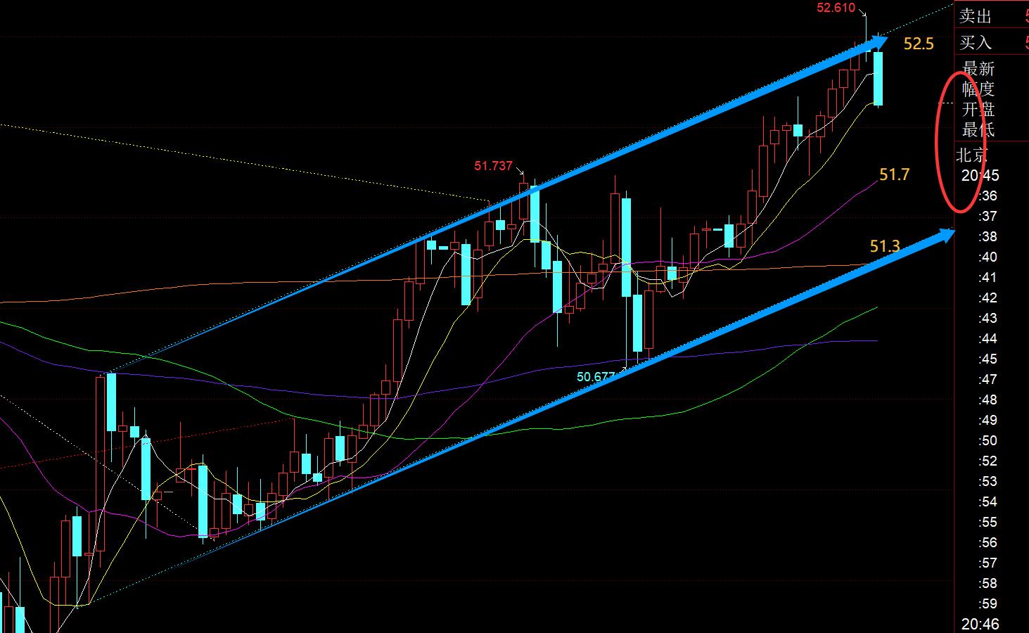 第二,白银方面:昨日它的运行走势,就完全依托图中黄色趋势压力线和蓝色通道下轨线,上下震荡运行,所以卡的位置会相对好些;早上51.6下承压回落,美盘50.8企稳拉升;日内也是先看跌再看企稳拉升,符合预判,来回震荡都逮住利润;