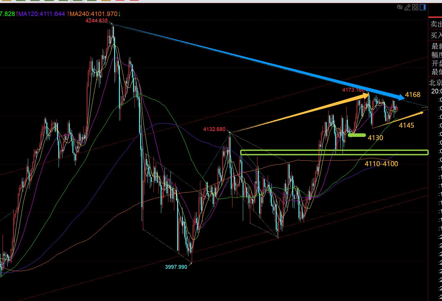 第二,黄金4小时级别:这两日一直围绕短期10均线上密集缠绕,前日区间是4150-4110,昨日区间是4170-4140;今晚继续关注10均线的有效得失情况,若出现大阴收盘失守,或连阴失守,且出现5日死叉10日,macd死叉等迹象共振,则代表向下会震荡打压修正一波,届时关注中轨4130一线支撑的企稳反弹;反之,未出现以上迹象共振,那么继续维持这种不强不弱的高位区间粘合运行,即便上去也预计容易冲高回落,因为会形成背离;