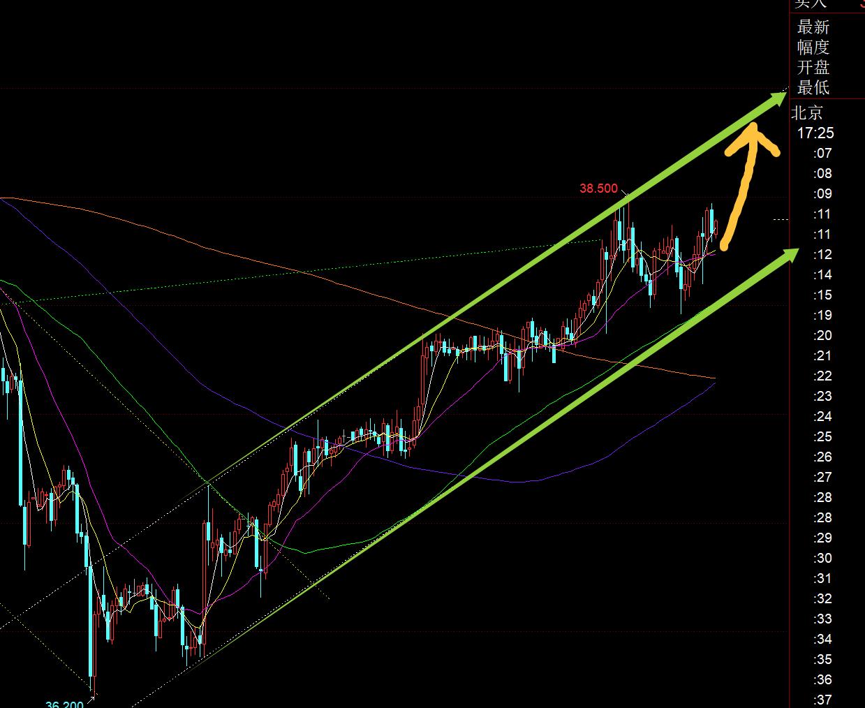 第二,白銀方面:昨日仍圍繞上行通道保持完好,一路台階式的拉升破高,最終抵達38.3一線目標,並有所上破;