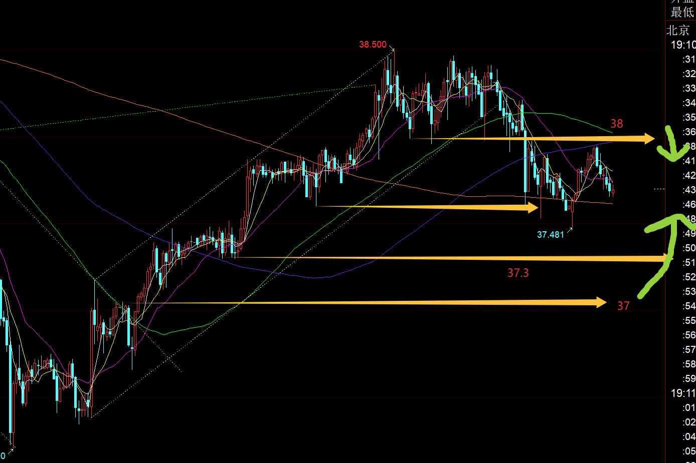 白銀方面:白銀上週一路連陽V拉升,本週一也是出陰打壓修正,接下來幾日也要震盪整理下,今晚留意幾處支撐37.3、37,日線級別靠近37是一個不錯的強支撐,預計極限此處也差不多了;而阻力比較明確就是38,一旦突破站穩它,又會開始逐步走強;因此,今晚38-37之間運行,37.3頂底位置也存在支撐,企穩都可短線看漲,沖不過38可看回落;